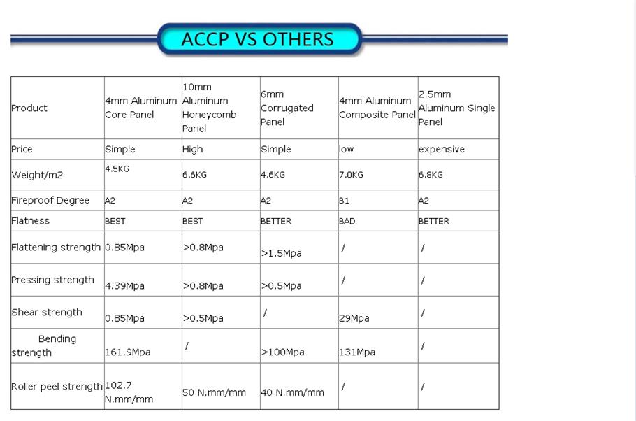 알루미늄 코어 복합 패널 ACCP는 알루미늄 벌집 패널과 알루미늄 복합 패널의 업데이트된 제품입니다. 알루미늄 코어 복합 패널은 저렴한 가격으로 알루미늄 벌집 패널보다 견고하고 가볍습니다. 게다가 알루미늄 복합 패널과 비교할 때 알루미늄 코어 복합 패널 내화 강도가 훨씬 우수합니다. PE는 없지만 알루미늄이 있습니다. 이것이 알루미늄 코어 복합 패널이 완전히 환경적이고 내화성이 있는 이유입니다. 또한 모양이 다양하여 돌, 나무, 거울 등 어떤 것이든 가공할 수 있습니다. 따라서 알루미늄 코어 복합 패널은 알루미늄 벌집 패널과 알루미늄 복합 패널을 완벽하게 대신할 수 있습니다.
